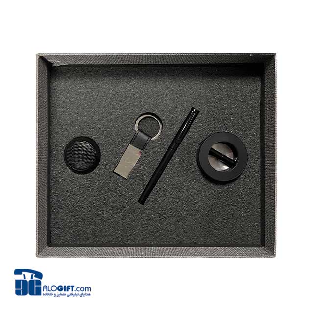 ست هدیه مدیریتی 4تیکه یک هدیه جمع وجور ولی کاربردی می باشد . هولدر موبایل وکیومی 360 درجه - مینی اسپیکر فلزی بلوتوثی - خودکار فلزی درب دار مدل شاینی ، جاکلیدی چرمی فلزی