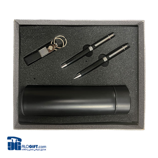 ست چهار تکه مدیریتی فلاکس درجه دار 500میل -جاکلیدی دو حلقه چرمی فلزی - خودکار و روان نویس مدیریتی گیره نقره ای