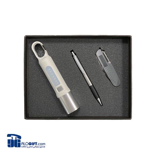 یک چراغ قوه چندحالته شارژی با کیفیت + خودکارمدیریتی بدنه فلزی برند معتبر پرزیدنت + یک ابزار جیبی چندکاره که همه دریک گیفت باکس با سایز متوسط گردآوری شده اند