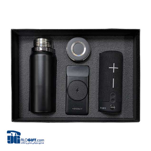 ست مدیریتی 3تکه اسپیکر استوانه ای برند ایکس انرژی /فلاکس 600میل استیل /پاوربانک 10هزار وایرلس استند موبایل برند ایکس انرژی